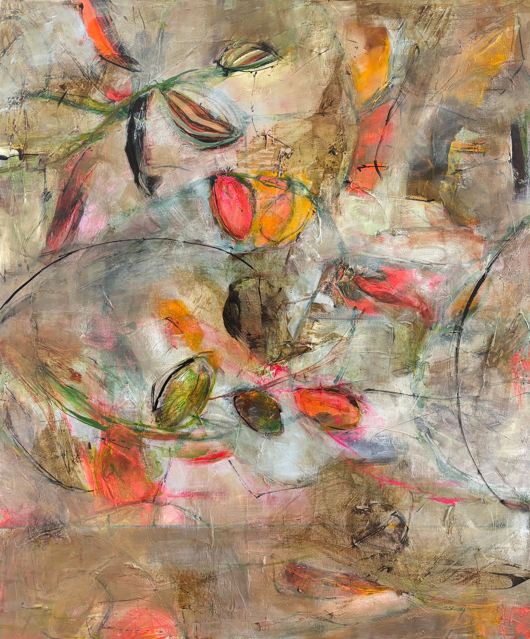 Mixed materials on natural linen canvas [acrylic, oil pastel, plaster, ink, book extracts, graphite]